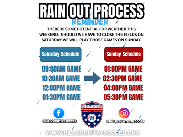All there is some weather forecasted for our area this Saturday 10/25. If the fields are closed due to the weather we will play the games on the following day, Sunday.