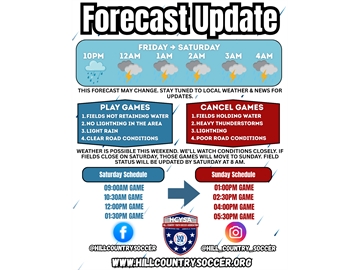 Weather is possible this weekend. We’ll watch conditions closely. If fields close on Saturday, those games will move to Sunday. Field status will be updated by Saturday at 8 AM.